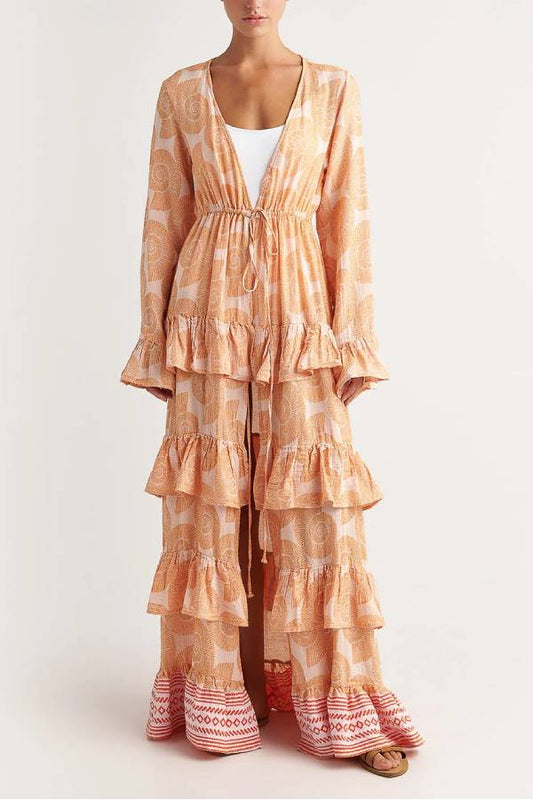 Soleil Conch Print Drawstring Waist Tiered Ruffles Cover-up Maxi Dress