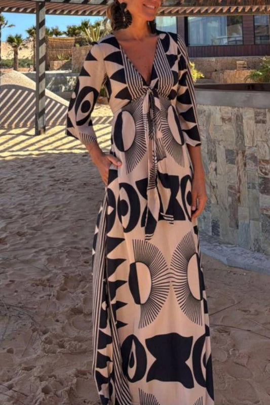 Unique Print V-Neck Tie Loose Pocket Casual Maxi Dress