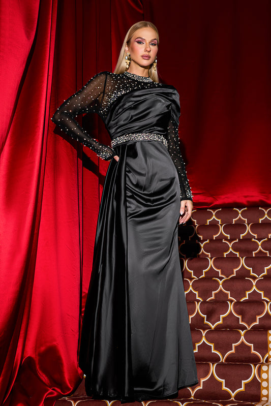Rhinestone Faux Pearl Satin Maxi Dress