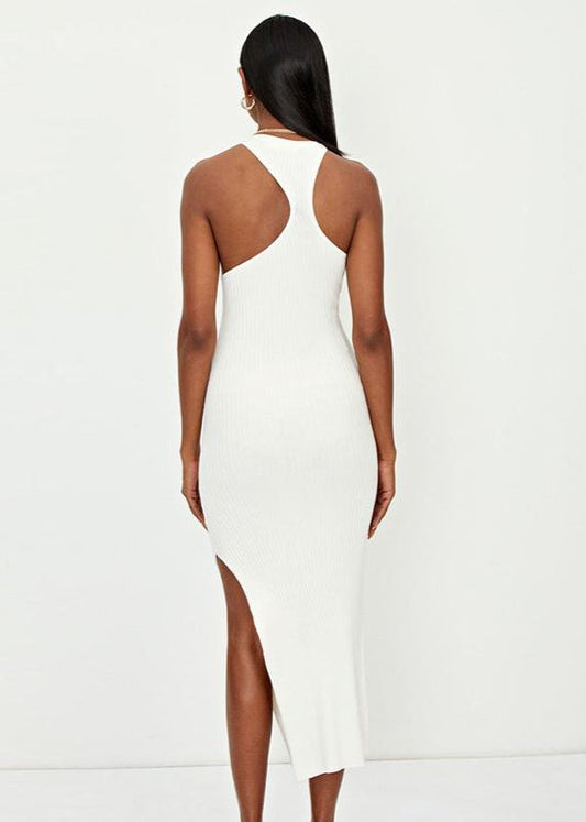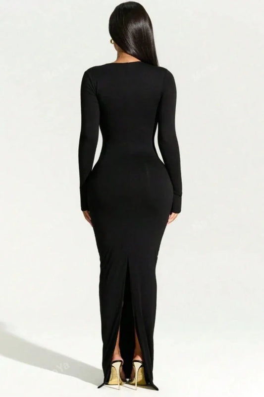 Luxe Knit Ruched Maxi Dress - Elegant U-Neck Split Design