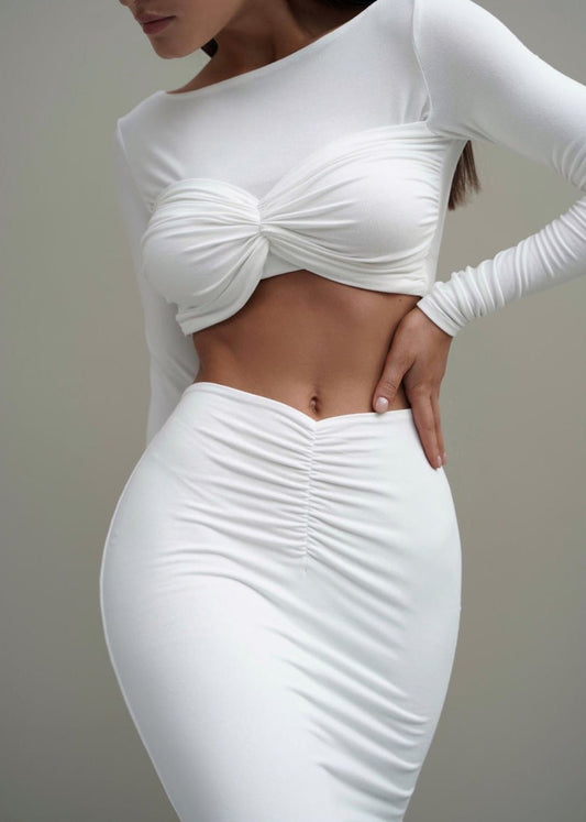 Elegant Shirred Maxi Skirt & Crop Top Set - White
