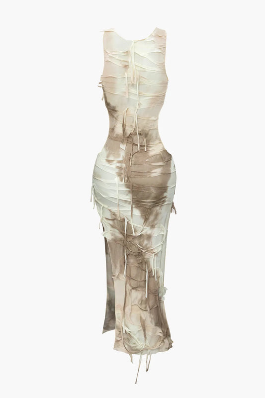 Cynthia Beige and Brown Tie Dye Distressed Cut Out Slit Maxi Dress