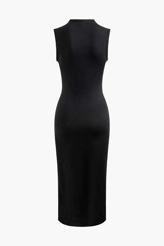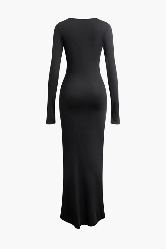 Jenna Black Slit Ruched Long Sleeve Round Neck Maxi Dress