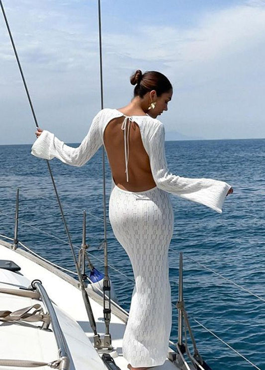 Coastal Allure - Open Back White Knit Maxi Dress