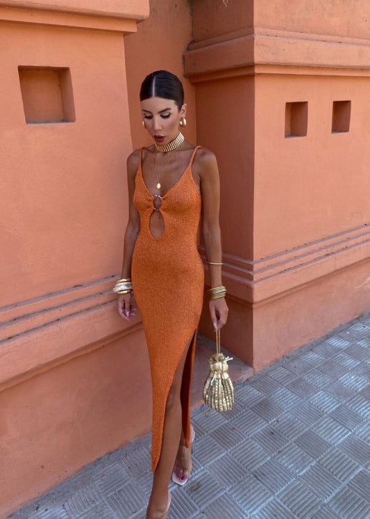 Sienna Ring Detail Knit Maxi Dress – Rust Bodycon with Side Slit
