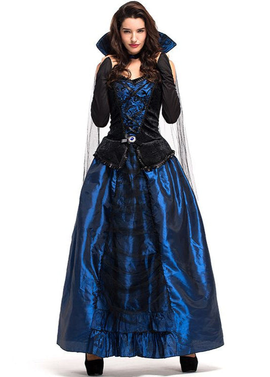 Midnight Duchess - Women’s Blue and Black Vampire Costume Gown with High Collar