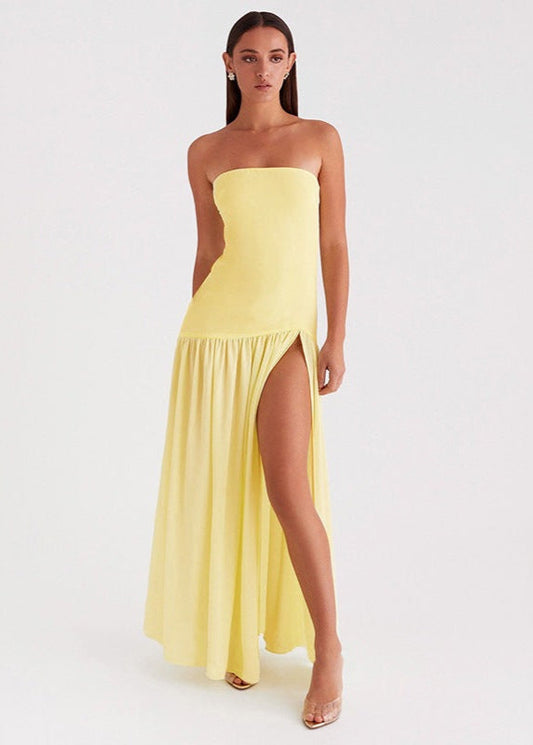 Solar Mirage – Strapless Yellow Maxi Dress with Side Slit