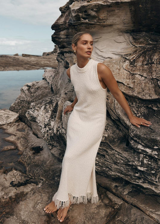 Coastal Thread - Sleeveless Knit Maxi Dress with Fringe Hem