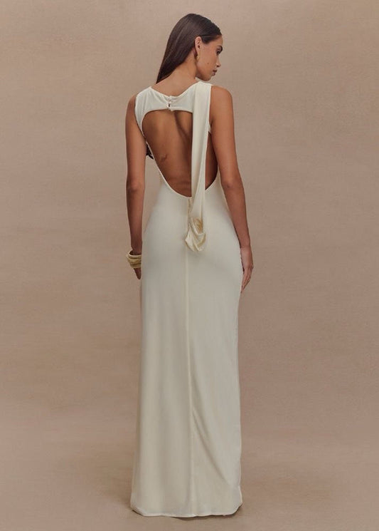 Champagne Drape Back Gown – Sleeveless Maxi with Open Back