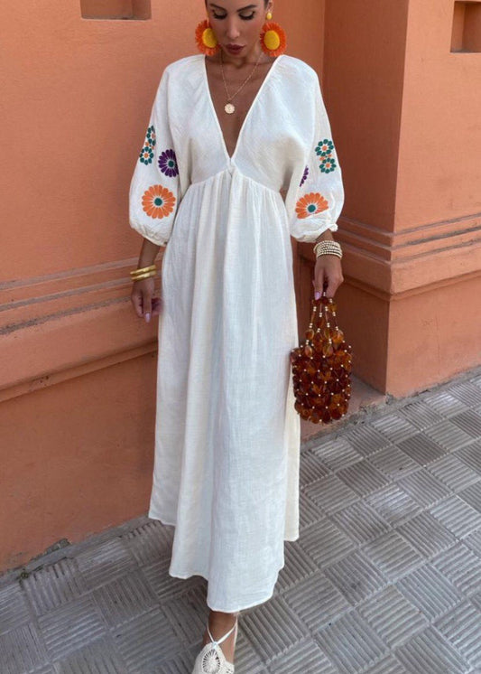Solana Embroidered Maxi Dress – Boho Open-Back with Balloon Sleeves