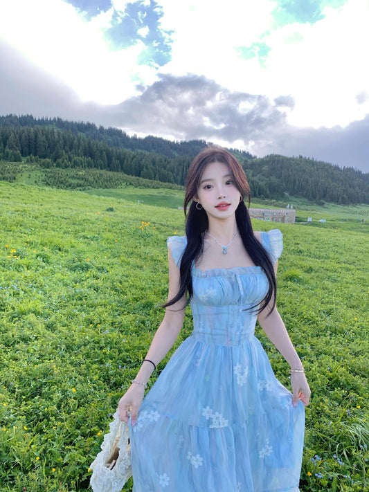 French Vintage-Inspired Watercolor Maxi Dress Soft, Elegant, & Airy