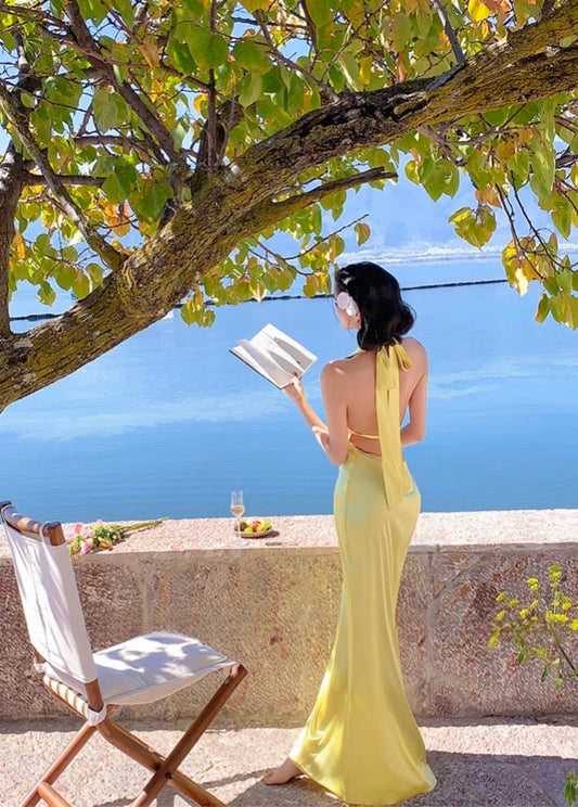 French Halter V-Neck Backless Maxi Dress Elegant Beach Vacation Sundress