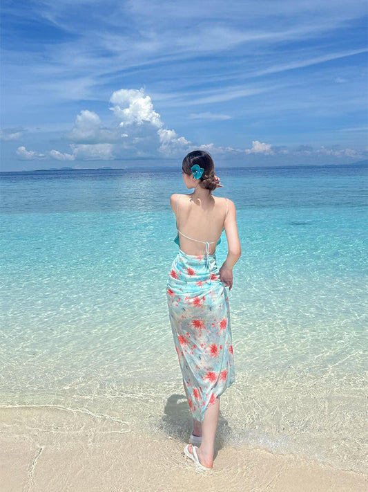 Ruffled Floral Split Maxi Dress Feminine Open-Back Summer Beach Dress