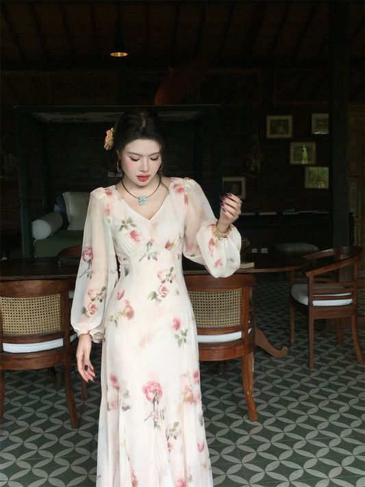 French Pink Floral Long Sleeve Maxi Dress Elegant V-Neck Plus Size Fairycore Gown gunne sax vintage dress