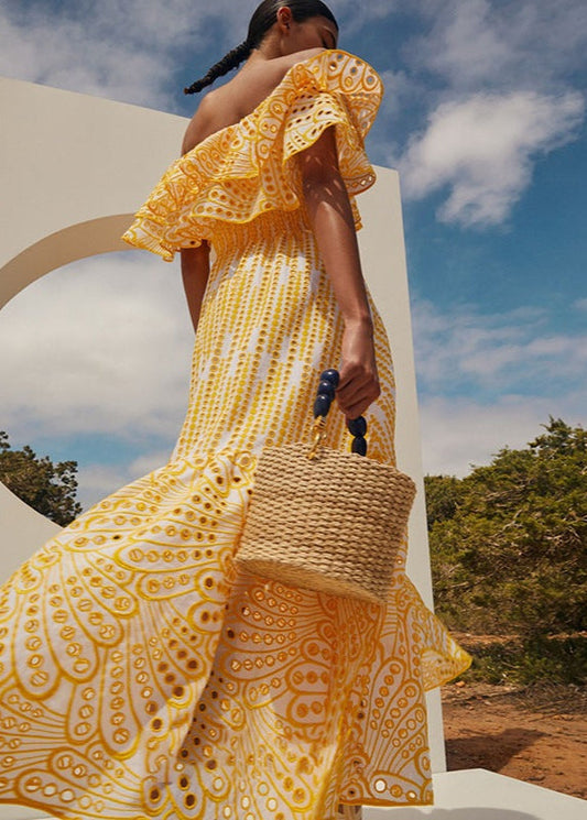 Fiorella Embroidered Maxi Dress – Eyelet Cotton Dress with Open Back & Ruffle Straps