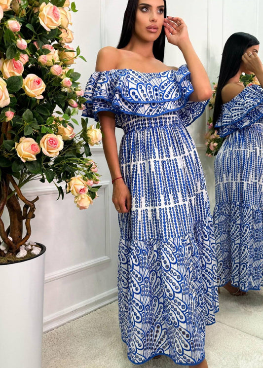 Marina Ruffle Off-Shoulder Dress – Blue EmbroideRed Boho Maxi