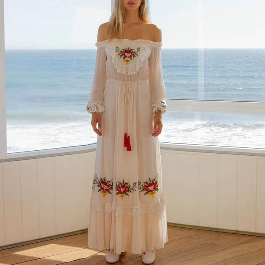 White Maxi Dress Cotton Floral Embroidery Sexy V-neck Beach Dress