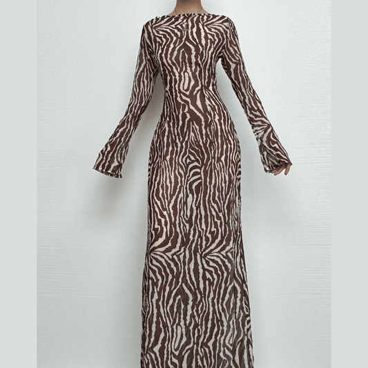 Sheer mesh see through zebra print long sleeve zip-up contrast maxi dress