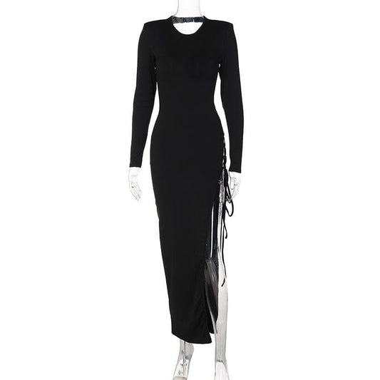 Lace up irregular long sleeve hollow out backless cut out maxi dress