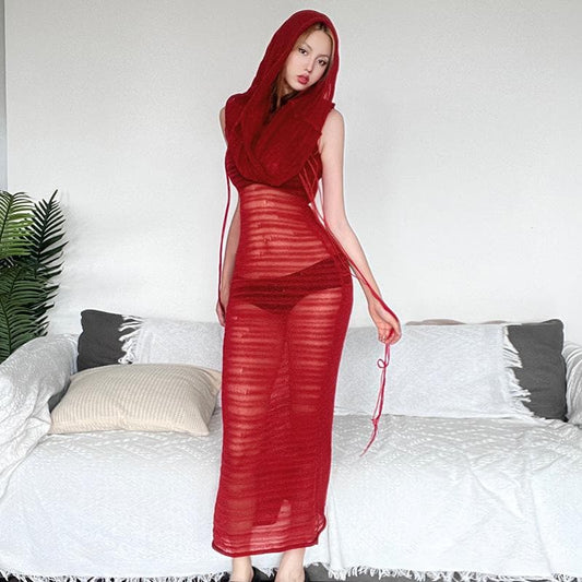 Crochet solid hoodie sleeveless see through maxi dress