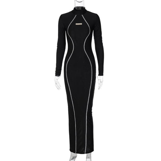 Patchwork mesh contrast long sleeve high neck maxi dress