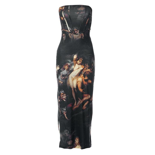 Slit abstract contrast bustier backless tube maxi dress