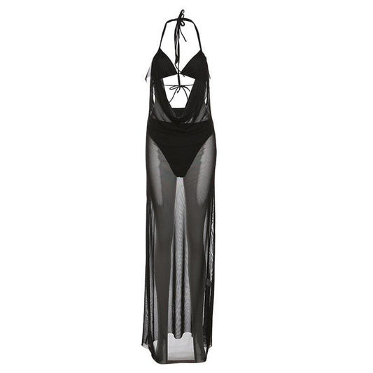Mesh see through o ring hollow out backless tube cut out maxi dress