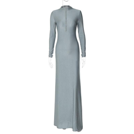 High neck long sleeve zip-up solid maxi dress