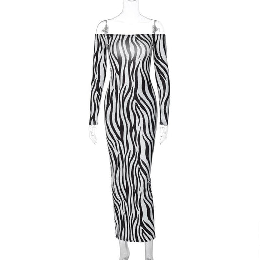 Zebra print off shoulder long sleeve contrast maxi dress