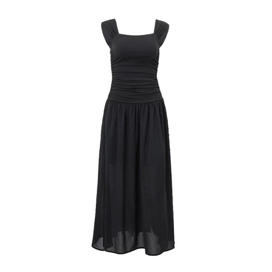 Square neck ruched backless cap sleeve solid maxi dress