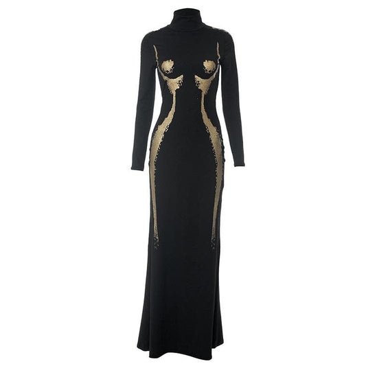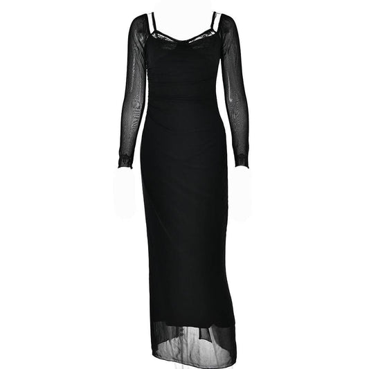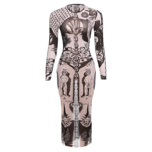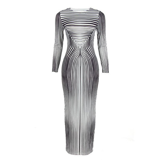 Sheer mesh abstract contrast see through long sleeve maxi dress