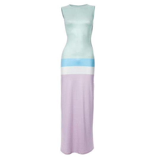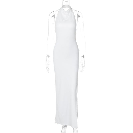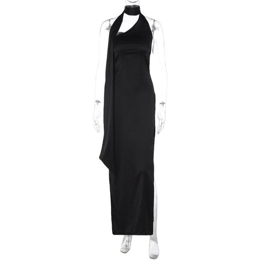 Halter solid irregular sleeveless backless self tie slit maxi dress