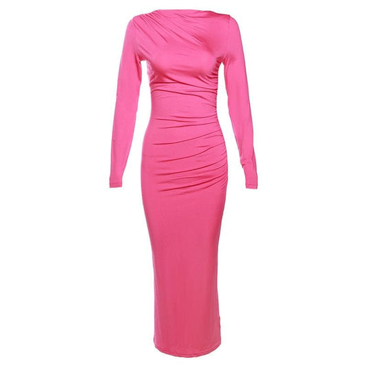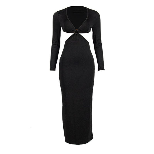 Solid o ring long sleeve v neck hollow out cut out maxi dress