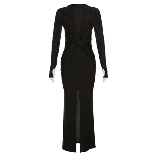 Hollow out self tie solid long sleeve cross front cut out maxi dress