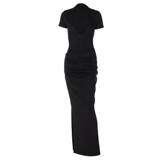 Short sleeve v neck ruched low cut slit solid maxi dress