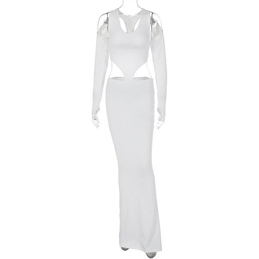 Long sleeve gloves irregular hollow out crewneck cut out maxi dress