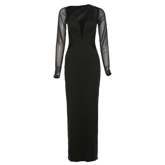 Contrast irregular mesh patchwork long sleeve slit maxi dress