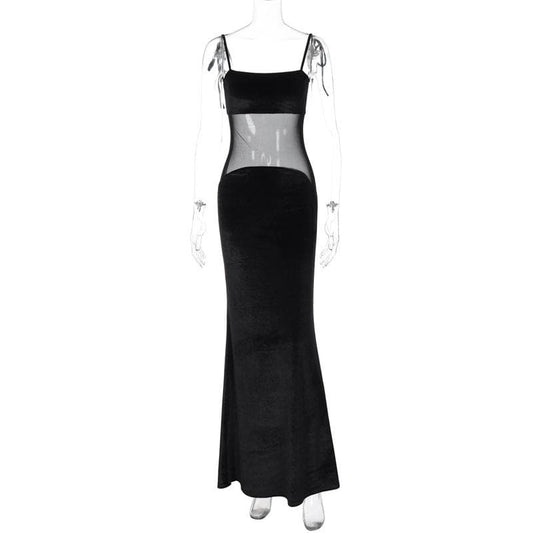 Self tie mesh patchwork backless velvet solid cami maxi dress