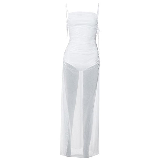 Ruched mesh ruffle sweetheart neck cami maxi dress