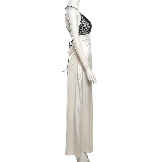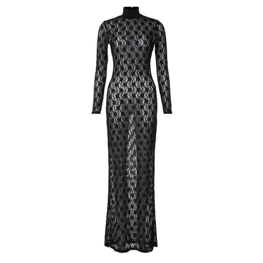 Long sleeve crewneck lace hollow out high slit cut out maxi dress