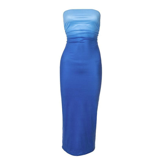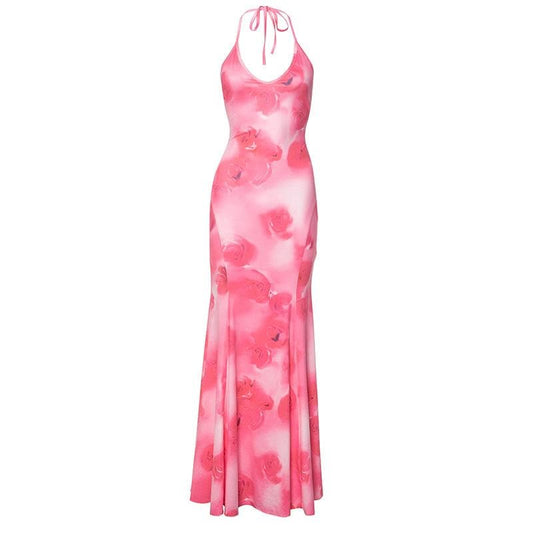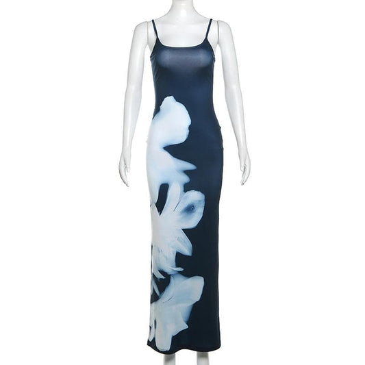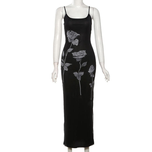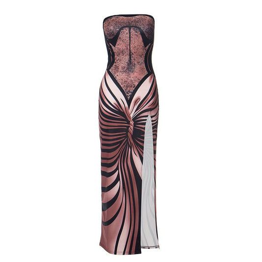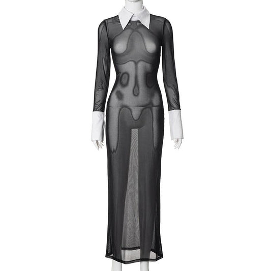 Long sleeve high neck print sheer mesh gloves maxi dress