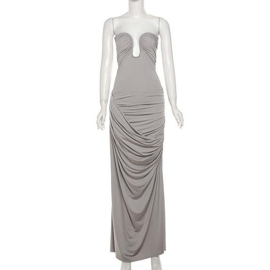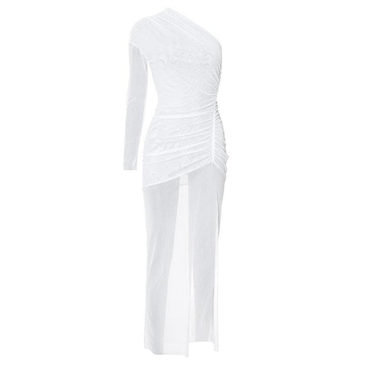 Long sleeve off shoulder sheer mesh ruched slit maxi dress