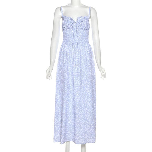 Flower print u neck contrast ruched slit backless cami maxi dress