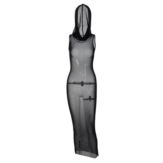 Sheer mesh see through backless ruffle slit cap sleeve maxi dress
