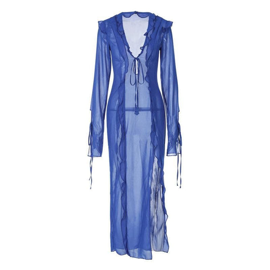 Flared sleeve ruffle sheer mesh see through self tie maxi dress