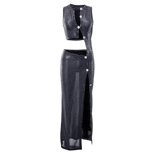 Irregular button hollow out slit sleeveless textured cut out maxi dress