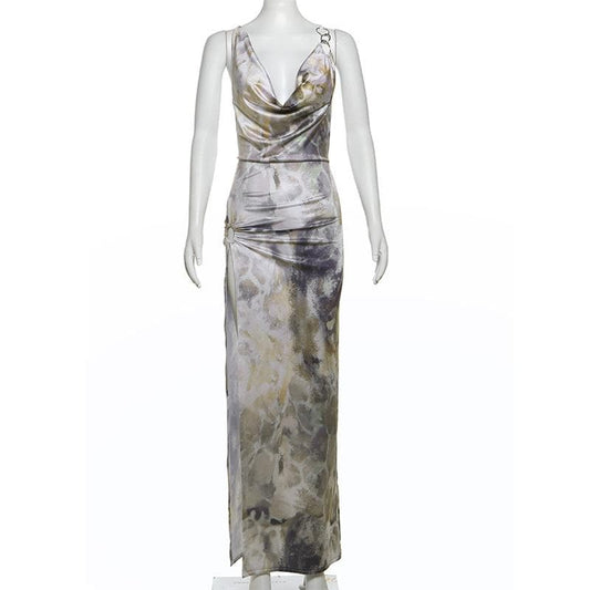 Metal chain halter ruched sheer mesh hollow out cut out maxi dress
