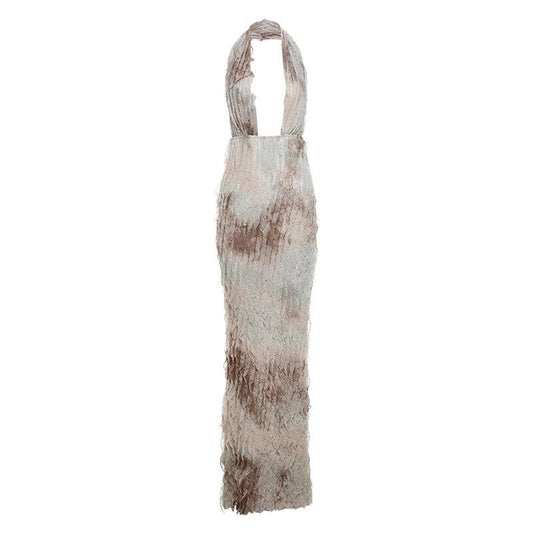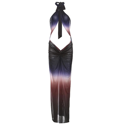 Ruched halter self tie cross front sheer mesh gradient maxi dress