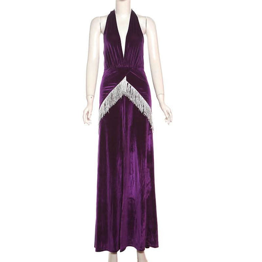 Halter v neck velvet tassels slit backless maxi dress
