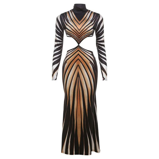 High neck long sleeve hollow out print contrast cut out maxi dress